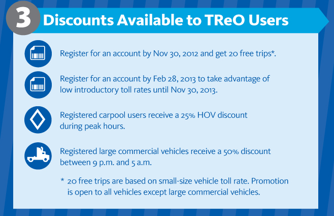 Below are some screenshots of the TReO website showing toll rates and discount information: